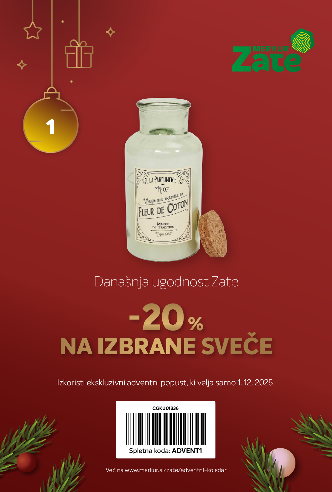 V decembru ti podarjamo malo vsakdanjega veselja. Od 1. do 24. decembra odpri svoje dnevno adventno presenečenje s klikom na spodnjo sliko — vsak dan te čaka drugačna ugodnost: popusti, recepti, DIY-nasveti in lepe misli. Samo za člane programa MERKUR Zate.