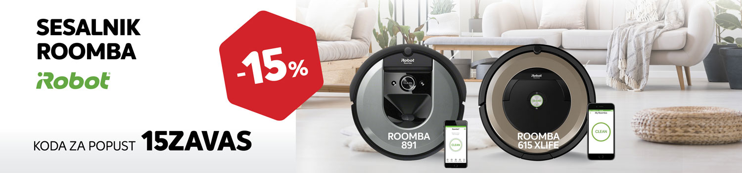 Spletna koda za 15 % popust velja od 1. 4. do 30. 4. 2020 pri nakupu v Spletnemu centru MERKUR na izbrana sesalnika Roomba iRobot po rednih cenah. Ob plačilu v spletni košarici vnesite kodo 15ZAVAS. Kako unovčiti kodo pri spletnem nakupu si lahko preberete TUKAJ. Koda za popust se ne sešteva z ostalimi kuponi in boni.