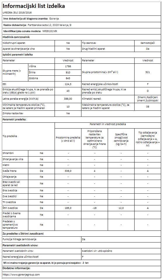Blagovna znamka GORENJE ENERGIJSKI RAZRED F EMISIJA HRUPA 43 DB VIŠINA 178,6 CM GARANCIJA V LETIH 5 LET Mnenja