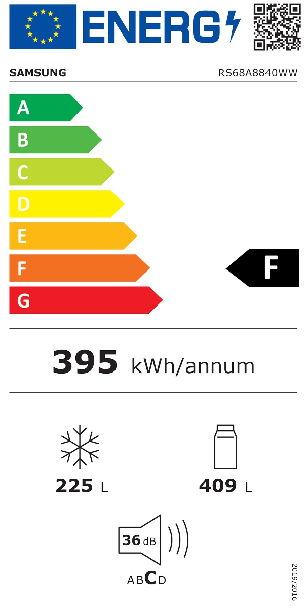 Blagovna znamka SAMSUNG VRSTA HLADILNIKA AMERIŠKI PROSTORNINA HLADILNI DEL 409 L PROSTORNINA ZAMRZOVALNI DEL 225 L LETNA PORABA ELEKTRIČNE ENERG. 395 KWH SAMODEJNO ODTAJEVANJE-NO FROST DA ŠIRINA 91,2 CM ZMOGLJIVOST ZAMRZOVANJA 12 KG/24 H VIŠINA 178 CM SHRANJEVALNI ČAS OB MOTNJAH 10 H GLOBINA 71,6 CM CONA SVEŽINE DA BARVA BELA POVEZLJIVOST WI-FI NE PRIKLOP NA VODO DA ENERGIJSKI RAZRED F INVERTERSKI KOMPRESOR DA KLIMATSKI RAZRED SN: +10 DO +32°C T: +18 DO +43°C EMISIJA HRUPA 36 DB ODPIRANJE VRAT DVOJNA VRATA RAZRED EMISIJE HRUPA C GARANCIJA V LETIH 2 LETI -