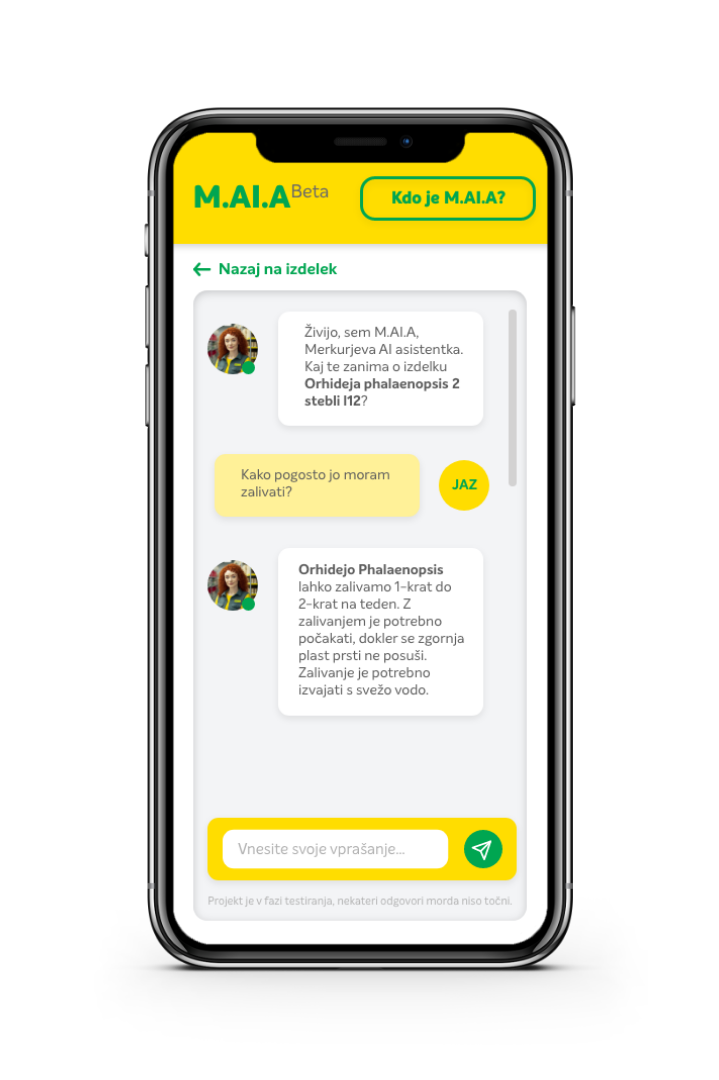 Virtualna AI asistentka MAIA je pomemben del našega truda k nenehnemu izboljševanju in sodobnim digitalnim rešitvam. Deluje na osnovi najnovejših dosežkov v umetni inteligenci, s čimer si prizadevamo ponuditi vrhunsko podporo našim strankam 24 ur na dan. Kljub visoki tehnološki dovršenosti lahko prihaja do neskladij v interpretaciji podatkov ali odgovorih, ki jih MAIA generira. Prijazno vas prosimo, da za potrditev informacij ali dodatno pomoč kontaktirate naše svetovalce preko telefona ali osebno v eni izmed naših trgovin.