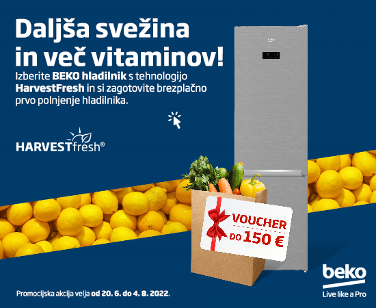 Vrednostni voucher prejmete le ob nakupu Beko hladilnika s tehnologijo HarvestFresh, kupljenim v obdobju od 20. 6. do 4. 8. 2022.