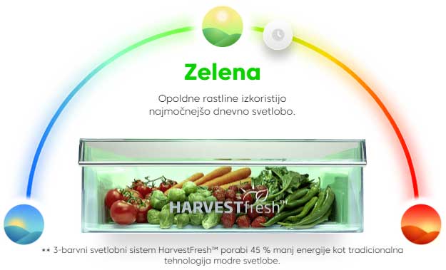 Tehnologija HarvestFresh™ je osnovana na 3 posebnih barvnih lučeh**, ki posnemajo vsakodnevno sončno pot in naravno dnevno svetlobo. S tem vaše sadje in zelenjava ohranjata vitamine dlje.* Tako lahko uživate v bolj zdravem življenjskem slogu z bolj hranljivimi obroki kot kadarkoli.