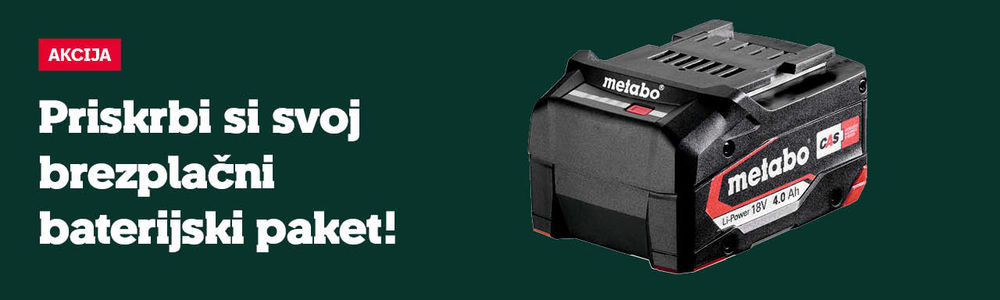 Za izbrana baterijska električna orodja (akcijske naprave)* Metabo, kupljena in registrirana v akcijskem obdobju od 01.09.2025 do vključno 31.03.2026, vam brezplačno dostavimo še en 18-V baterijski paket LiPOWER Metabo s 4,0 Ah – do razprodaje zalog.