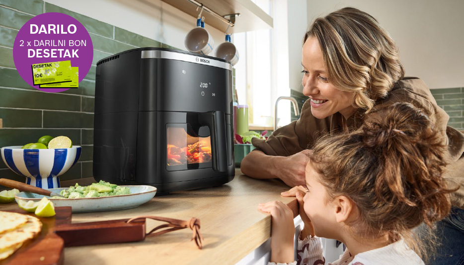Od 1. 2. do 30. 4. 2026 vam ob nakupu Bosch Air Fryer cvrtnika na vroč zrak podarimo 2 darilna bona "Desetak".
