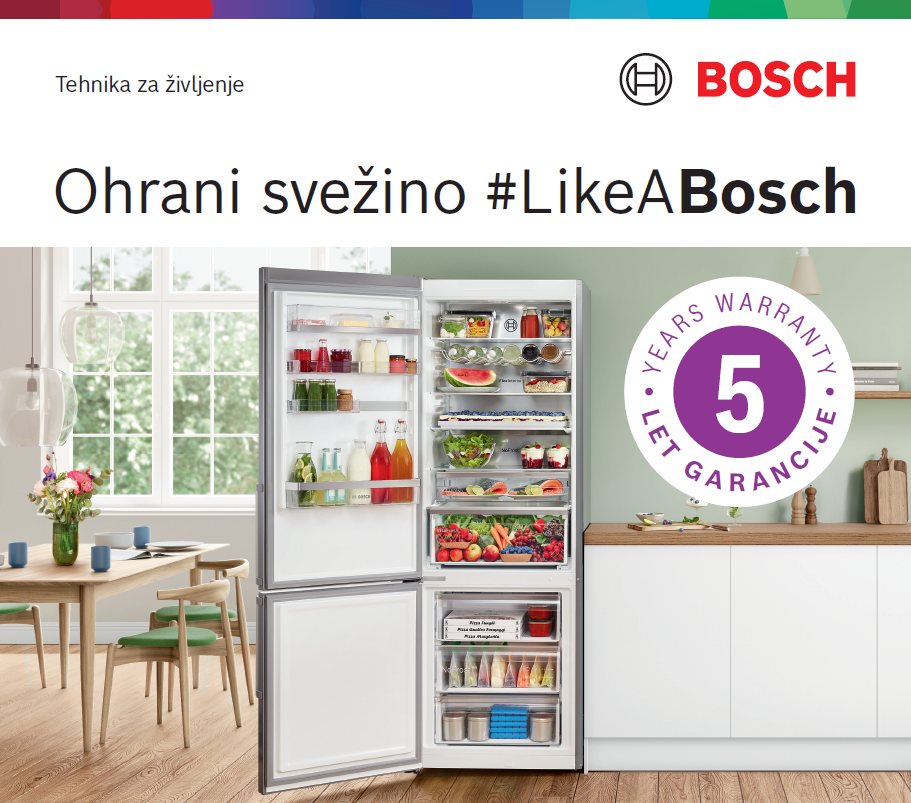 v obdobju od 1. aprila do 15. septembra 2025 bo potekala promocija podaljšane garancije (poleg 2-letne garancije proizvajalca še 3 leta brezplačne podaljšane garancije) za vgradne in prostostoječe aparate za hlajenje in/ali zamrzovanje Bosch.