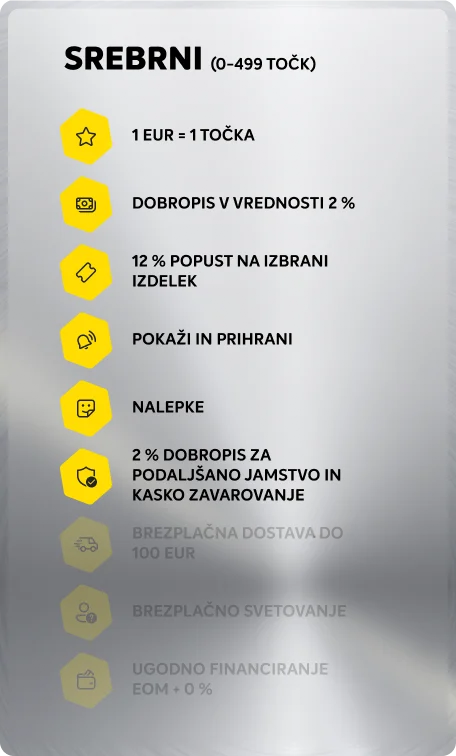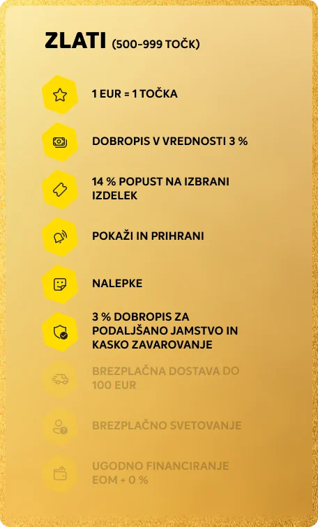 Zbirajte statusne točke in napredujte po lestvici paketov - od začetnega srebrnega do najboljšega platinastega. Višji paket prinaša več ugodnosti. Točke zbirate z vsakim nakupom (1 EUR prinese 1 točko) ter z aktivnostmi v aplikaciji.