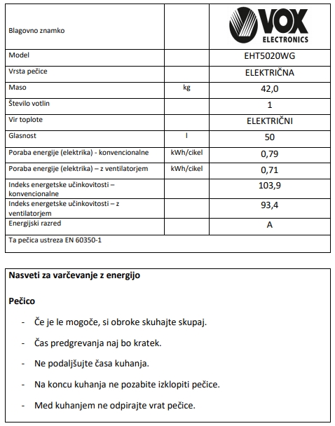 ELEKTRIČNI ŠTEDILNIK VOX EHT5020WG