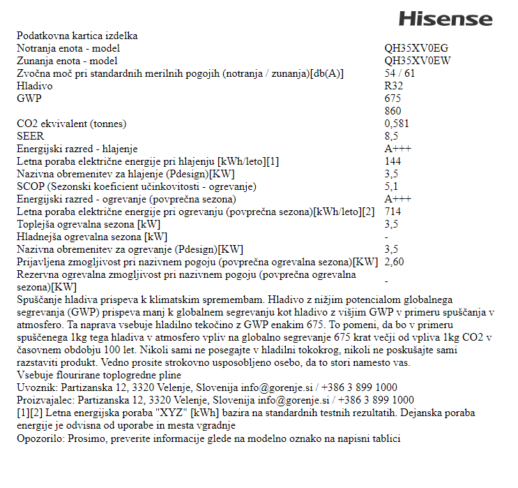 HISENSE KLIMATSKA NAPRAVA ENERGY NORDIC QH35XV0EG-QH35XV0EW, 3,5 KW