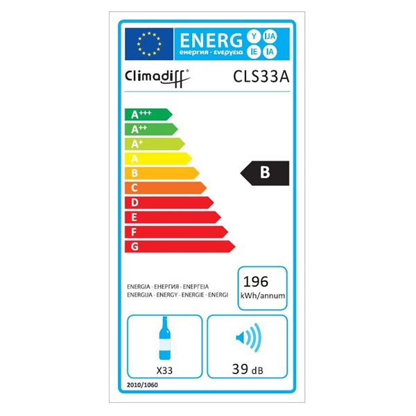 Climadiff hladilna vitrina je izdelek visoke kakovosti z izredno tihim delovanjem ter kompaktno velikostjo. Je samostoječa ter omogoča shranjevaje do kar 33 steklenic. Spada v energijski razred B, ima steklena vrata z zrcalno-efektnim dvojno kaljenim steklom ter okvirjem iz nerjavečega jekla. Napravo odlikujejo 1 stalna kovinska košara, sistem proti vibracijam, bela LED osvetlitev s stikalom, modri elektronski termometer za prikaz, 6 pritrjenih jeklenih žic, 4 nastavljiva rebra ter izjemno učinkovito hlajenje s pomočjo ventilatorja.