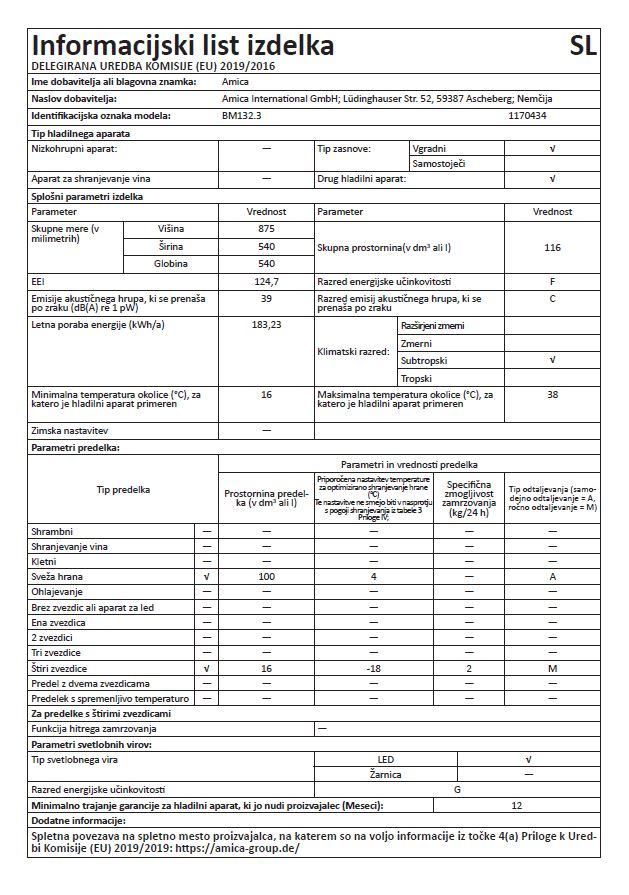 Blagovna znamka AMICA VRSTA HLADILNIKA VGRADNI PROSTORNINA HLADILNI DEL 100 L LETNA PORABA ELEKTRIČNE ENERG. 183 KWH ŠIRINA 54 CM SAMODEJNO ODTAJEVANJE-NO FROST NE VIŠINA 87,5 CM GLOBINA 54 CM CONA SVEŽINE NE BARVA BELA POVEZLJIVOST WI-FI NE ENERGIJSKI RAZRED F INVERTERSKI KOMPRESOR NE KLIMATSKI RAZRED N: +16 DO +32°C ST: +18 DO +38°C EMISIJA HRUPA 39 DB ODPIRANJE VRAT LEVO/DESNO RAZRED EMISIJE HRUPA C GARANCIJA V LETIH 2 -