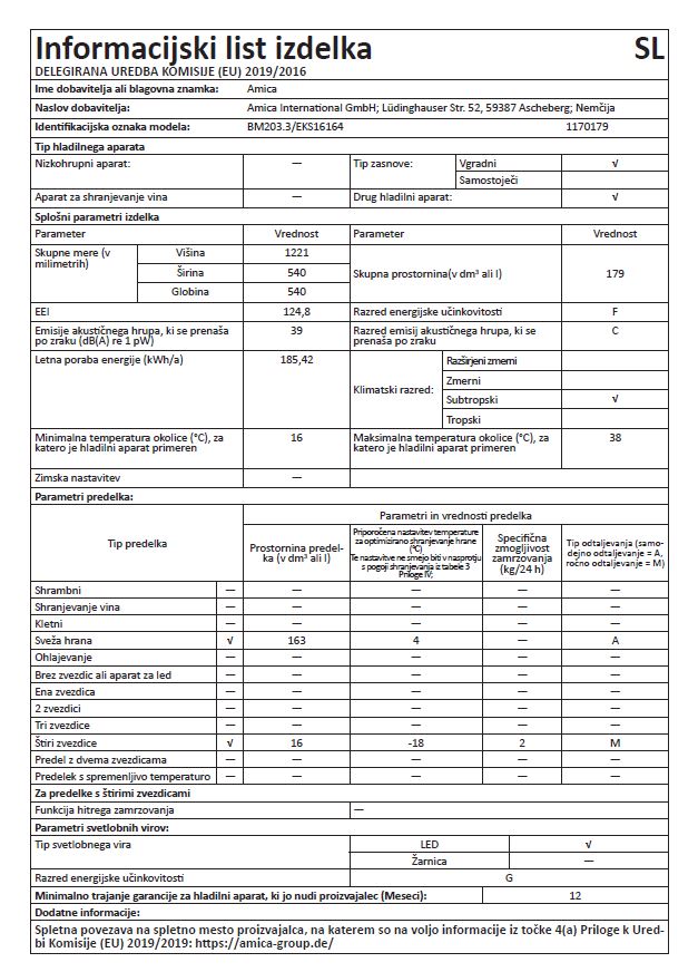 Blagovna znamka AMICA VRSTA HLADILNIKA VGRADNI PROSTORNINA HLADILNI DEL 163 L LETNA PORABA ELEKTRIČNE ENERG. 185 KWH ŠIRINA 54 CM SAMODEJNO ODTAJEVANJE-NO FROST NE ZMOGLJIVOST ZAMRZOVANJA 2 KG/24 H VIŠINA 122,1 CM GLOBINA 54 CM CONA SVEŽINE NE BARVA BELA POVEZLJIVOST WI-FI NE ENERGIJSKI RAZRED F INVERTERSKI KOMPRESOR NE KLIMATSKI RAZRED N: +16 DO +32°C ST: +18 DO +38°C EMISIJA HRUPA 39 DB ODPIRANJE VRAT LEVO/DESNO RAZRED EMISIJE HRUPA C GARANCIJA V LETIH 2 -
