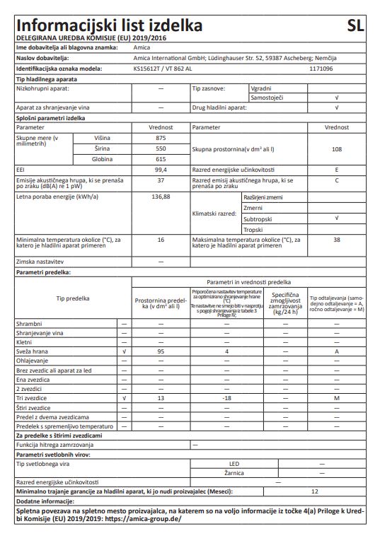 Blagovna znamka AMICA ENERGIJSKI RAZRED E VRSTA HLADILNIKA SAMOSTOJNI PROSTORNINA HLADILNI DEL 95 L PROSTORNINA ZAMRZOVALNI DEL 13 L LETNA PORABA ELEKTRIČNE ENERG. 137 KWH SAMODEJNO ODTAJEVANJE-NO FROST NE ZMOGLJIVOST ZAMRZOVANJA 2 KG/24 H ŠIRINA 55 CM SHRANJEVANJE OB IZPADU EL.ENER 11 H CONA SVEŽINE NE GLOBINA 61,5 CM BARVA BEŽ INVERTERSKI KOMPRESOR NE KLIMATSKI RAZRED ST: +18 DO +38°C EMISIJA HRUPA 37 DB RAZRED EMISIJE HRUPA C ODPIRANJE VRAT DESNO POVEZLJIVOST WI-FI NE VIŠINA 86 CM GARANCIJA V LETIH 2 Mnenja