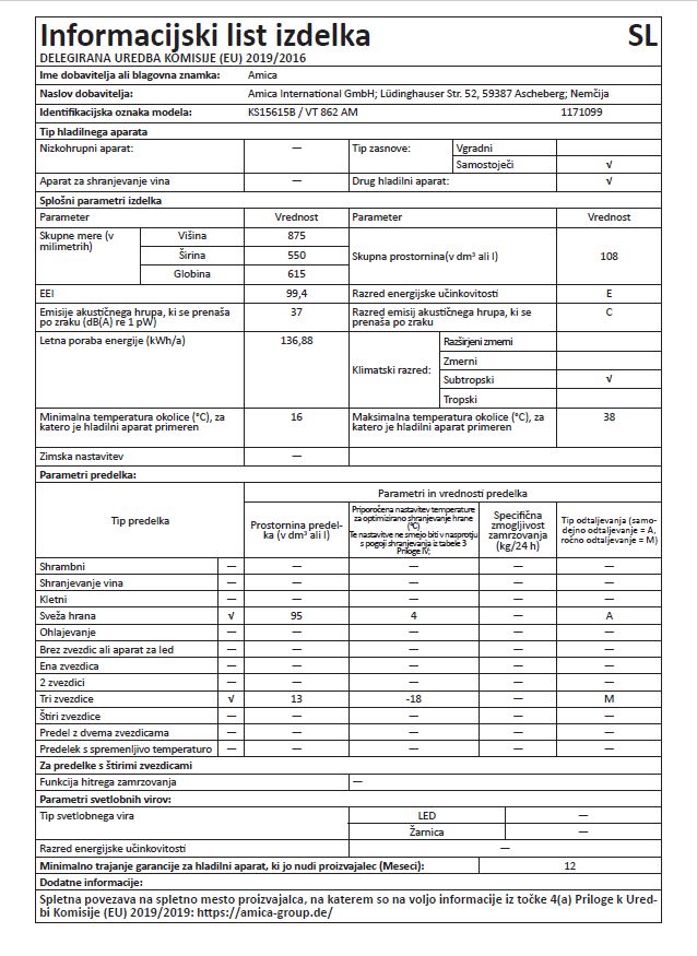 Blagovna znamka AMICA ENERGIJSKI RAZRED E VRSTA HLADILNIKA SAMOSTOJNI PROSTORNINA HLADILNI DEL 95 L PROSTORNINA ZAMRZOVALNI DEL 13 L LETNA PORABA ELEKTRIČNE ENERG. 137 KWH SAMODEJNO ODTAJEVANJE-NO FROST NE ZMOGLJIVOST ZAMRZOVANJA 2 KG/24 H ŠIRINA 55 CM SHRANJEVANJE OB IZPADU EL.ENER 11 H CONA SVEŽINE NE GLOBINA 61,5 CM BARVA BEŽ INVERTERSKI KOMPRESOR NE KLIMATSKI RAZRED ST: +18 DO +38°C EMISIJA HRUPA 37 DB RAZRED EMISIJE HRUPA C ODPIRANJE VRAT DESNO POVEZLJIVOST WI-FI NE VIŠINA 86 CM GARANCIJA V LETIH 2 Mnenja
