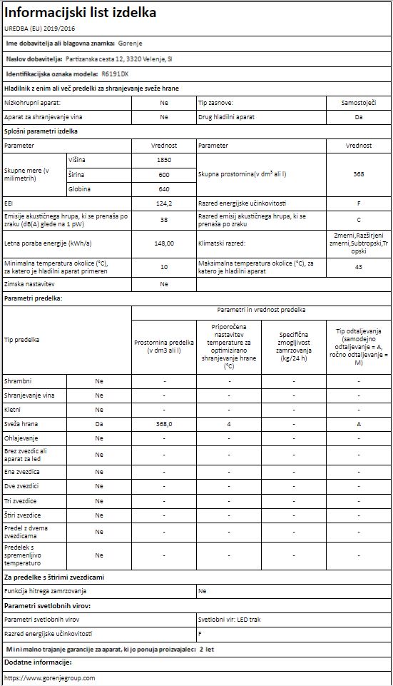 Blagovna znamka GORENJE ENERGIJSKI RAZRED F VRSTA HLADILNIKA SAMOSTOJNI UPRAVLJANJE MEHANSKO PROSTORNINA HLADILNI DEL 368 L LETNA PORABA ELEKTRIČNE ENERG. 148 KWH SAMODEJNO ODTAJEVANJE-NO FROST NE ŠIRINA 60 CM CONA SVEŽINE DA GLOBINA 64 CM BARVA SIVA INVERTERSKI KOMPRESOR NE KLIMATSKI RAZRED SN-T: +10 DO +43°C EMISIJA HRUPA 38 DB RAZRED EMISIJE HRUPA C ODPIRANJE VRAT LEVO/DESNO POVEZLJIVOST WI-FI NE VIŠINA 185 CM GARANCIJA V LETIH 5 LET Mnenja