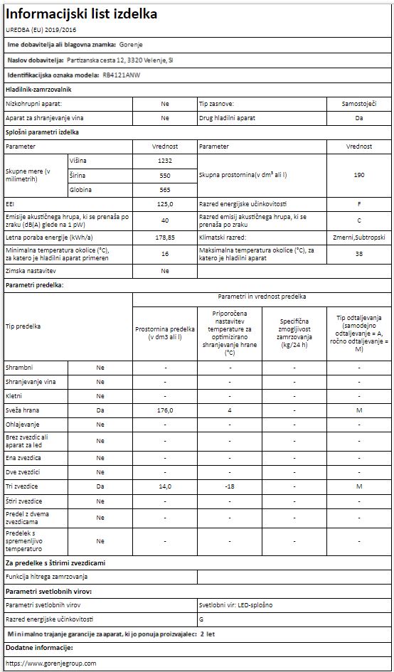 Blagovna znamka GORENJE ENERGIJSKI RAZRED F VRSTA HLADILNIKA SAMOSTOJNI PROSTORNINA HLADILNI DEL 176 L PROSTORNINA ZAMRZOVALNI DEL 14 L LETNA PORABA ELEKTRIČNE ENERG. 178,85 KWH SAMODEJNO ODTAJEVANJE-NO FROST NE ŠIRINA 55 CM CONA SVEŽINE NE GLOBINA 56,5 CM BARVA BELA INVERTERSKI KOMPRESOR NE KLIMATSKI RAZRED N: +16 DO +32°C ST: +18 DO +38°C EMISIJA HRUPA 40 DB RAZRED EMISIJE HRUPA C ODPIRANJE VRAT LEVO/DESNO POVEZLJIVOST WI-FI NE VIŠINA 123,2 CM GARANCIJA V LETIH 5 LET Mnenja
