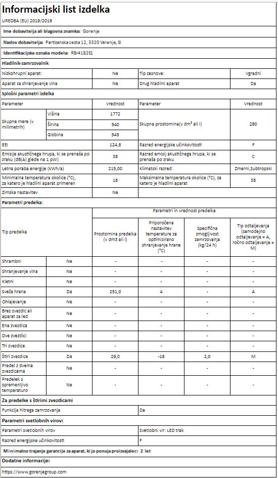 Blagovna znamka GORENJE ENERGIJSKI RAZRED F VRSTA HLADILNIKA VGRADNI PROSTORNINA HLADILNI DEL 251 L PROSTORNINA ZAMRZOVALNI DEL 29 L LETNA PORABA ELEKTRIČNE ENERG. 215 KWH SAMODEJNO ODTAJEVANJE-NO FROST NE ŠIRINA 54 CM SHRANJEVANJE OB IZPADU EL.ENER 14 H CONA SVEŽINE DA GLOBINA 54,5 CM BARVA BELA INVERTERSKI KOMPRESOR NE KLIMATSKI RAZRED N: +16 DO +32°C ST: +18 DO +38°C EMISIJA HRUPA 38 DB RAZRED EMISIJE HRUPA C ODPIRANJE VRAT LEVO/DESNO POVEZLJIVOST WI-FI NE VIŠINA 177,2 CM GARANCIJA V LETIH 5 LET Mnenja