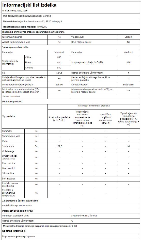 Blagovna znamka GORENJE ENERGIJSKI RAZRED F VRSTA HLADILNIKA VGRADNI PROSTORNINA HLADILNI DEL 129 L LETNA PORABA ELEKTRIČNE ENERG. 115 KWH SAMODEJNO ODTAJEVANJE-NO FROST NE ŠIRINA 54 CM CONA SVEŽINE NE GLOBINA 54 CM BARVA BELA INVERTERSKI KOMPRESOR NE KLIMATSKI RAZRED N: +16 DO +32°C ST: +18 DO +38°C EMISIJA HRUPA 39 DB RAZRED EMISIJE HRUPA C ODPIRANJE VRAT LEVO/DESNO POVEZLJIVOST WI-FI NE VIŠINA 88 CM GARANCIJA V LETIH 5 LET Mnenja