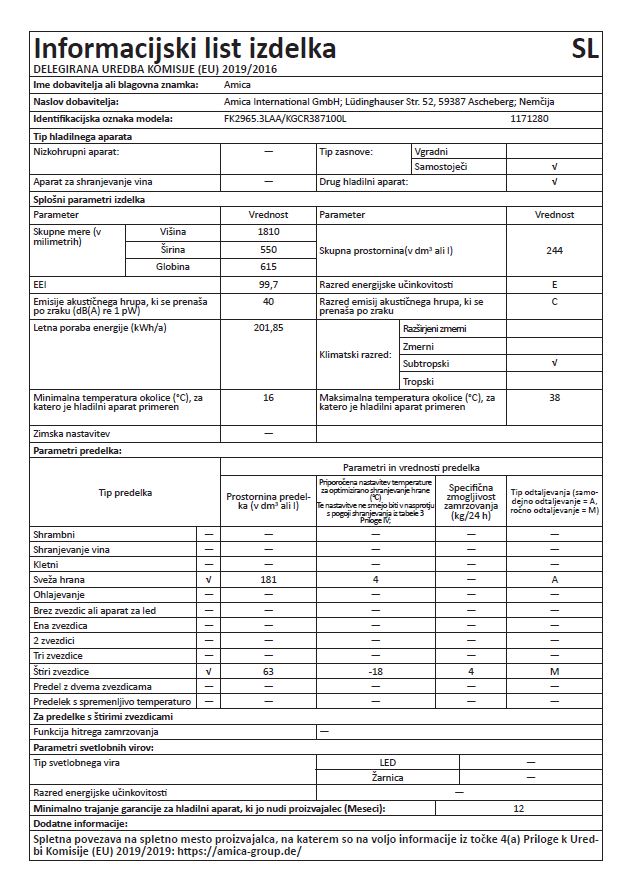 Blagovna znamka AMICA ENERGIJSKI RAZRED E VRSTA HLADILNIKA ZAMRZOVALNIK SPODAJ PROSTORNINA HLADILNI DEL 181 L PROSTORNINA ZAMRZOVALNI DEL 63 L LETNA PORABA ELEKTRIČNE ENERG. 202 KWH SAMODEJNO ODTAJEVANJE-NO FROST NE ZMOGLJIVOST ZAMRZOVANJA 3 KG/24 H ŠIRINA 55 CM SHRANJEVALNI ČAS OB MOTNJAH 15 H CONA SVEŽINE NE GLOBINA 61,5 CM BARVA MODRA INVERTERSKI KOMPRESOR NE KLIMATSKI RAZRED N: +16 DO +32°C ST: +16 DO +38°C EMISIJA HRUPA 40 DB RAZRED EMISIJE HRUPA C ODPIRANJE VRAT DESNO POVEZLJIVOST WI-FI NE VIŠINA 181 CM GARANCIJA V LETIH 2 Mnenja