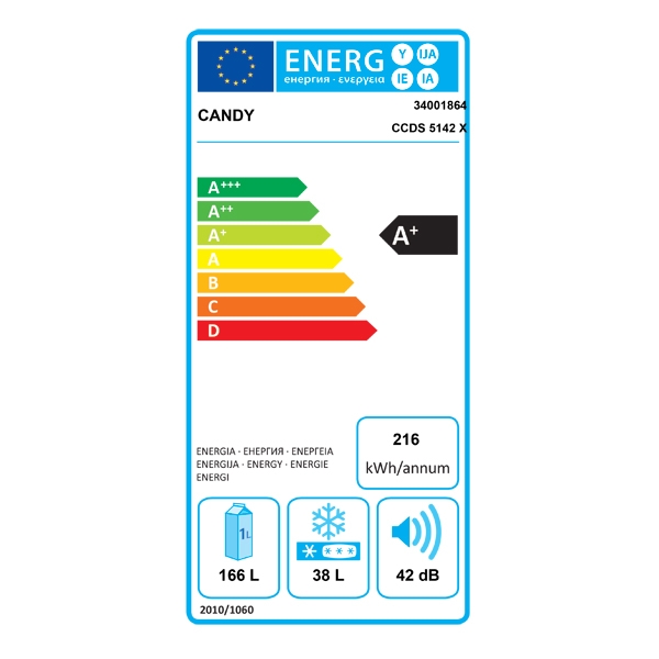Dvovratni hladilnik Candy CCDS 5142X z zamrzovalnikom zgoraj v energijskem razredu A+.