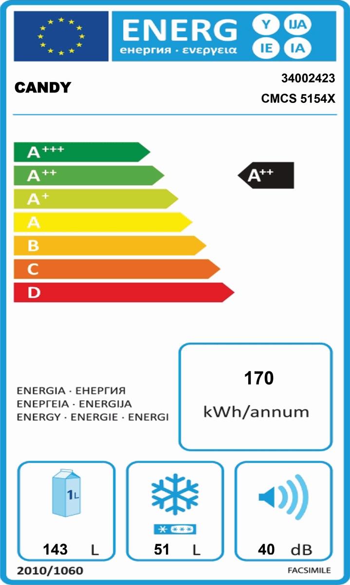 Candy prostostoječi hladilnik CMCS 5154 X z zamrzovalnikom spodaj spada v A++ energijski razred in ima prostornino 143 l v hladilnem in 51 l v zamrzovalnem predelu. Notranjost ima LED osvetlitev, za udobno odpiranje pa poskrbi integriran ročaj. Hladilnik spada v klimatski razred ST z glasnostjo delovanja 40 dB.