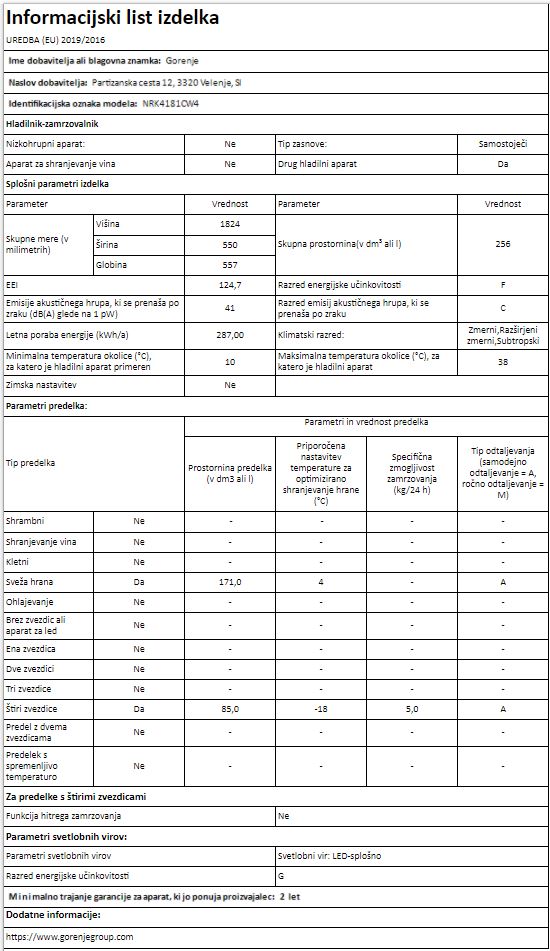 Blagovna znamka GORENJE ENERGIJSKI RAZRED F VRSTA HLADILNIKA SAMOSTOJNI, ZAMRZ. SPODAJ PROSTORNINA HLADILNI DEL 171 L PROSTORNINA ZAMRZOVALNI DEL 85 L LETNA PORABA ELEKTRIČNE ENERG. 287 KWH SAMODEJNO ODTAJEVANJE-NO FROST DA ZMOGLJIVOST ZAMRZOVANJA 9 KG/24 H ŠIRINA 55 CM CONA SVEŽINE DA GLOBINA 55,7 CM BARVA BELA INVERTERSKI KOMPRESOR NE KLIMATSKI RAZRED N: +16 DO +32°C ST: +16 DO +38°C T: +16 DO +43°C EMISIJA HRUPA 41 DB RAZRED EMISIJE HRUPA C ODPIRANJE VRAT LEVO/DESNO POVEZLJIVOST WI-FI NE VIŠINA 182,4 CM GARANCIJA V LETIH 5 Mnenja