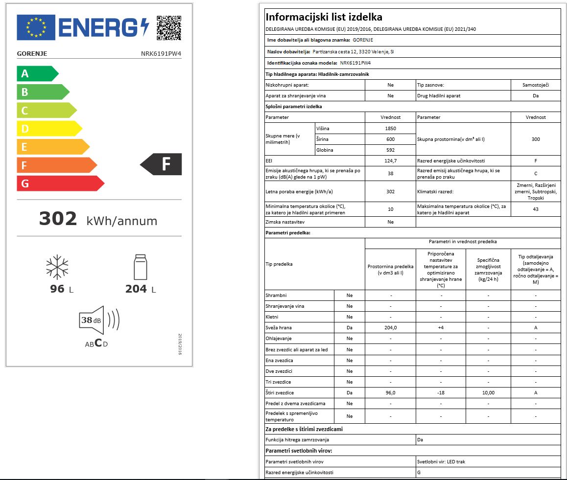 Blagovna znamka GORENJE ENERGIJSKI RAZRED F VRSTA HLADILNIKA SAMOSTOJNI, ZAMRZ. SPODAJ PROSTORNINA HLADILNI DEL 204 L PROSTORNINA ZAMRZOVALNI DEL 96 L LETNA PORABA ELEKTRIČNE ENERG. 302 KWH SAMODEJNO ODTAJEVANJE-NO FROST DA ZMOGLJIVOST ZAMRZOVANJA 10 KG/24 H ŠIRINA 60 CM CONA SVEŽINE DA GLOBINA 59,2 CM BARVA BELA INVERTERSKI KOMPRESOR NE KLIMATSKI RAZRED N: +16 DO +32°C SN: +10 DO +32°C ST: +16 DO +38°C EMISIJA HRUPA 38 DB RAZRED EMISIJE HRUPA C ODPIRANJE VRAT LEVO/DESNO POVEZLJIVOST WI-FI NE VIŠINA 185 CM GARANCIJA V LETIH 5 LET Mnenja