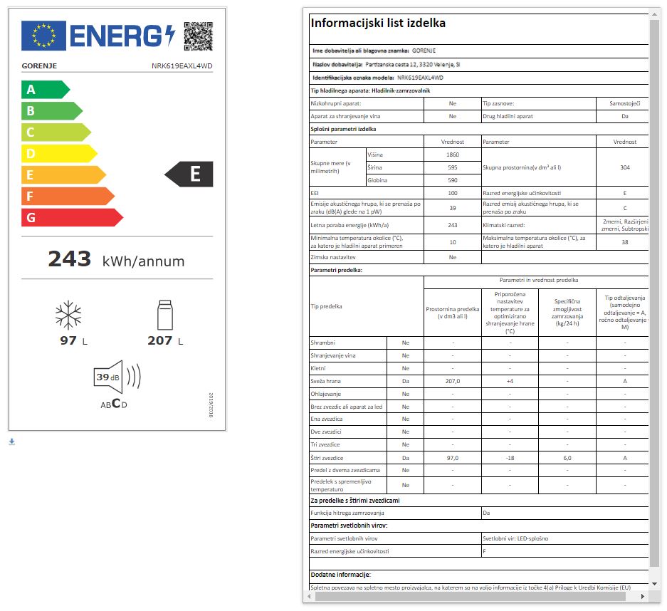Blagovna znamka GORENJE ENERGIJSKI RAZRED E VRSTA HLADILNIKA SAMOSTOJNI, ZAMRZ. SPODAJ UPRAVLJANJE LCD DISPLAY SENZORSKO UPRAVLJANJE PROSTORNINA HLADILNI DEL 207 L PROSTORNINA ZAMRZOVALNI DEL 97 L LETNA PORABA ELEKTRIČNE ENERG. 243 KWH SAMODEJNO ODTAJEVANJE-NO FROST DA ZMOGLJIVOST ZAMRZOVANJA 6 KG/24 H ŠIRINA 59,5 CM CONA SVEŽINE DA GLOBINA 59 CM BARVA SIVA INVERTERSKI KOMPRESOR NE KLIMATSKI RAZRED N: +16 DO +32°C SN: +10 DO +32°C ST: +18 DO +38°C EMISIJA HRUPA 39 DB RAZRED EMISIJE HRUPA C ODPIRANJE VRAT LEVO/DESNO POVEZLJIVOST WI-FI NE VIŠINA 186 CM GARANCIJA V LETIH 5 Mnenja