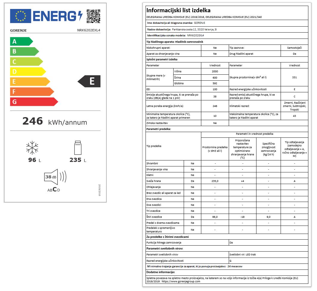 Blagovna znamka GORENJE ENERGIJSKI RAZRED E VRSTA HLADILNIKA SAMOSTOJNI, ZAMRZ. SPODAJ PROSTORNINA HLADILNI DEL 235 L PROSTORNINA ZAMRZOVALNI DEL 96 L LETNA PORABA ELEKTRIČNE ENERG. 246 KWH SAMODEJNO ODTAJEVANJE-NO FROST DA ZMOGLJIVOST ZAMRZOVANJA 9 KG/24 H ŠIRINA 60 CM CONA SVEŽINE NE GLOBINA 59,2 CM BARVA METALIZIRANO SIVA INVERTERSKI KOMPRESOR NE KLIMATSKI RAZRED SN-T: +10 DO +43°C EMISIJA HRUPA 38 DB RAZRED EMISIJE HRUPA C ODPIRANJE VRAT LEVO/DESNO POVEZLJIVOST WI-FI NE VIŠINA 200 CM GARANCIJA V LETIH 5 LET Mnenja