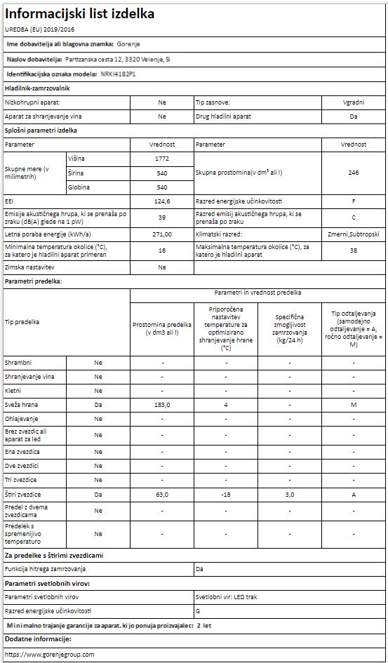 Blagovna znamka GORENJE ENERGIJSKI RAZRED F VRSTA HLADILNIKA VGRADNI, ZAMRZ. SPODAJ PROSTORNINA HLADILNI DEL 183 L PROSTORNINA ZAMRZOVALNI DEL 63 L LETNA PORABA ELEKTRIČNE ENERG. 271 KWH SAMODEJNO ODTAJEVANJE-NO FROST DA ZMOGLJIVOST ZAMRZOVANJA 3 KG/24 H ŠIRINA 54 CM CONA SVEŽINE NE GLOBINA 54 CM BARVA BELA INVERTERSKI KOMPRESOR NE KLIMATSKI RAZRED N: +16 DO +32°C ST: +16 DO +38°C EMISIJA HRUPA 39 DB RAZRED EMISIJE HRUPA C ODPIRANJE VRAT LEVO/DESNO POVEZLJIVOST WI-FI NE VIŠINA 177,2 CM GARANCIJA V LETIH 5 LET Mnenja