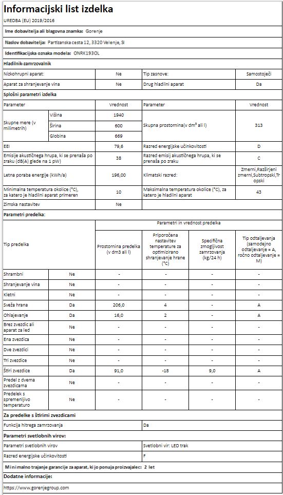 HLADILNIK IN ZAMRZOVALNIK GORENJE ONRK193OL