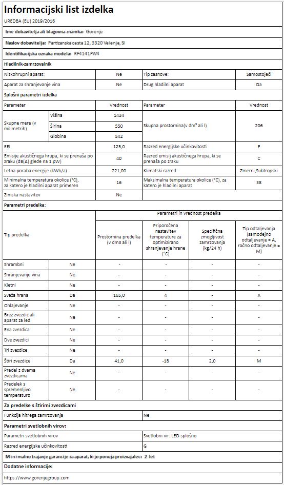 Blagovna znamka GORENJE VRSTA HLADILNIKA SAMOSTOJNI, ZAMRZ. ZGORAJ PROSTORNINA HLADILNI DEL 165 L PROSTORNINA ZAMRZOVALNI DEL 41 L LETNA PORABA ELEKTRIČNE ENERG. 221 KWH SAMODEJNO ODTAJEVANJE-NO FROST NE ZMOGLJIVOST ZAMRZOVANJA 2 KG/24 H ŠIRINA 55 CM CONA SVEŽINE NE GLOBINA 54,2 CM BARVA BELA INVERTERSKI KOMPRESOR NE KLIMATSKI RAZRED N: +16 DO +32°C ST: +16 DO +38°C EMISIJA HRUPA 40 DB RAZRED EMISIJE HRUPA C ODPIRANJE VRAT LEVO/DESNO POVEZLJIVOST WI-FI NE VIŠINA 143,4 CM ENERGIJSKI RAZRED F GARANCIJA V LETIH 5 LET Mnenja