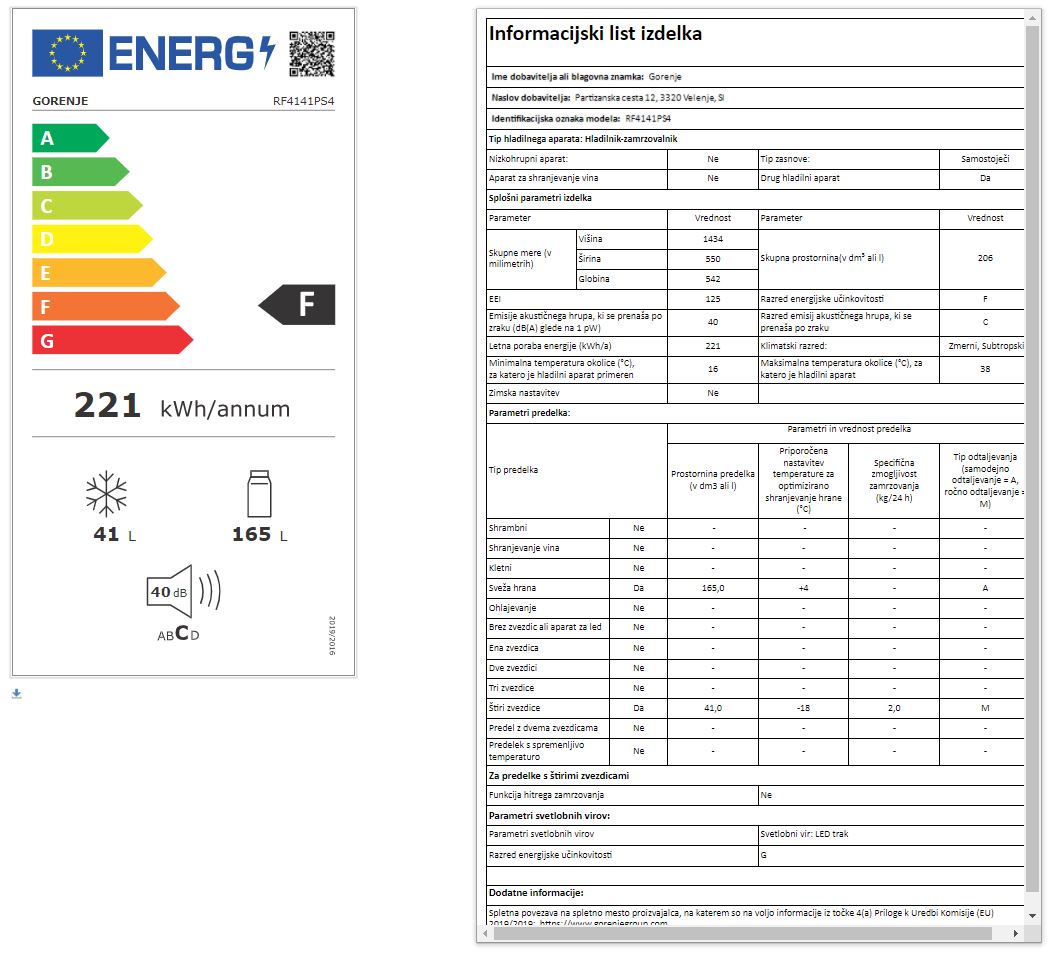 Blagovna znamka GORENJE ENERGIJSKI RAZRED F VRSTA HLADILNIKA SAMOSTOJNI, ZAMRZ. ZGORAJ PROSTORNINA HLADILNI DEL 165 L PROSTORNINA ZAMRZOVALNI DEL 41 L LETNA PORABA ELEKTRIČNE ENERG. 221 KWH SAMODEJNO ODTAJEVANJE-NO FROST NE ZMOGLJIVOST ZAMRZOVANJA 2 KG/24 H ŠIRINA 55 CM CONA SVEŽINE NE GLOBINA 54,2 CM BARVA SIVA INVERTERSKI KOMPRESOR NE KLIMATSKI RAZRED N: +16 DO +32°C ST: +16 DO +38°C EMISIJA HRUPA 40 DB RAZRED EMISIJE HRUPA C ODPIRANJE VRAT LEVO/DESNO POVEZLJIVOST WI-FI NE VIŠINA 143,5 CM GARANCIJA V LETIH 5 LET Mnenja