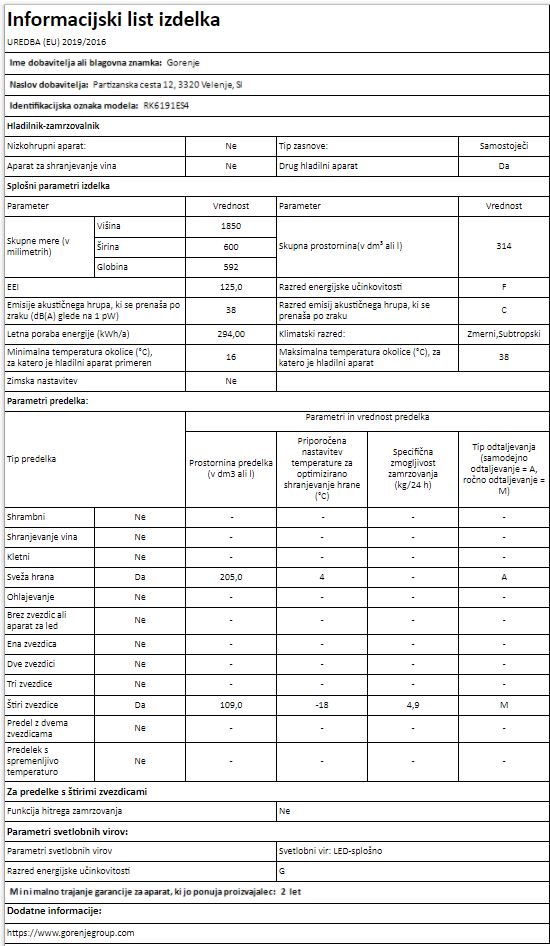 Blagovna znamka GORENJE VRSTA HLADILNIKA SAMOSTOJNI, ZAMRZ. SPODAJ BARVA METALIK PROSTORNINA HLADILNI DEL 205 L ŠIRINA 60 CM PROSTORNINA ZAMRZOVALNI DEL 109 L VIŠINA 185 CM LETNA PORABA ELEKTRIČNE ENERG. 294 KWH GLOBINA 59,2 CM SAMODEJNO ODTAJEVANJE-NO FROST NE ZMOGLJIVOST ZAMRZOVANJA 5 KG/24 H CONA SVEŽINE NE POVEZLJIVOST WI-FI NE ENERGIJSKI RAZRED F INVERTERSKI KOMPRESOR NE KLIMATSKI RAZRED N: +16 DO +32°C SN: +10 DO +32°C ST: +16 DO +38°C EMISIJA HRUPA 38 DB ODPIRANJE VRAT LEVO/DESNO RAZRED EMISIJE HRUPA C GARANCIJA V LETIH 5 LET - MnenjaHladilnik je zelo doberodličen izdelek, točno kot opisano!