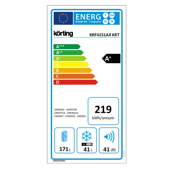 Blagovna znamka KORTING VRSTA HLADILNIKA SAMOSTOJNI, ZAMRZ. ZGORAJ PROSTORNINA HLADILNI DEL 171 L PROSTORNINA ZAMRZOVALNI DEL 41 L LETNA PORABA ELEKTRIČNE ENERG. 226 KWH ŠIRINA 55 CM SAMODEJNO ODTAJEVANJE-NO FROST NE VIŠINA 141,5 CM GLOBINA 58 CM GLASNOST DELOVANJA 41 DB CONA SVEŽINE NE BARVA INOX INVERTER MOTOR NE ENERGIJSKI RAZRED A+ KLIMATSKI RAZRED ST: +18 DO +38°C ODPIRANJE VRAT LEVO/DESNO GARANCIJA V LETIH 2 LETI -
