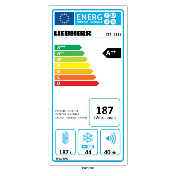 Hladilnik Liebherr z manjšim zamrzovalnikom na zgornji strani je kakovostna naprava za hitro in kvalitetno hlajenje ter zamrzovanje. Neto površina hladilnega dela znaša 191 L ter neto površino zamrzovalnega dela 44 L. Hladilna naprava je energetsko visoko varčna ter namenjena shranjevanju sveže hrane. Zahvaljujoč visokemu A++ energijskemu razredu je hlajenje izredno učinkovito, kar uporabniku prinese večji stroškovni prihranek. Zaradi dovršenega estetskega videza je primerna za vsako kuhinjo, ki ji s svojim elegantnim stilom doprinese lep moderen videz.