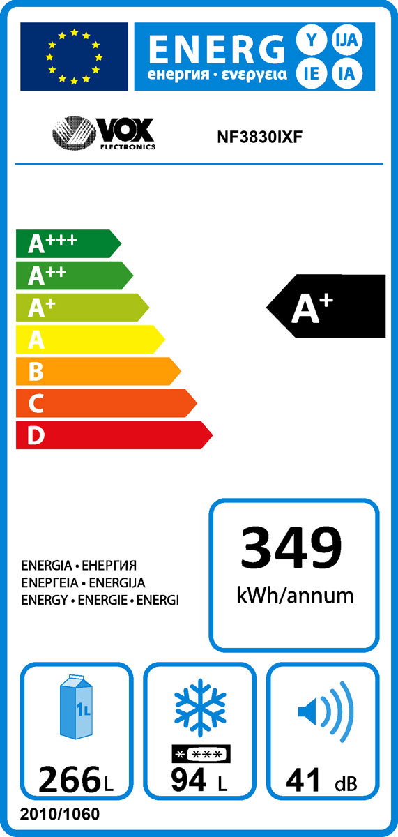 Prostostoječi kombinirani hladilnik VOX Electronics NF 3830 IX F spada v energijski razred F. Ima sistem avtomatskega odtaljevanja, ki omogoča lažje čiščenje hladilnika.Prostornina njegovega hladilnega dela znaša 266 l. Vanj so nameščene 5 steklenih polic.