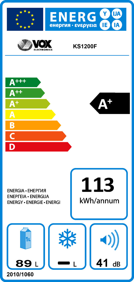 Prostostoječi hladilnik Vox KS 1200 F spada med varčne hladilnike, kar izkazuje dejstvo, da spada v energijski razred F.