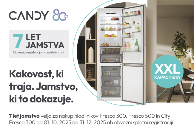 Velja za prostostoječe hladilnike Candy iz linij Fresco 500, Fresco 300 in City Fresco ter vgradne hladilnike Fresco 400, kupljene v obdobju od 1. oktobra do 31. decembra 2025. Ob nakupu in registraciji kupec pridobi 2 leti osnovne garancije + 5 let podaljšanega jamstva. Jamstvo 2 + 5 let velja za izbrane naprave spodaj.