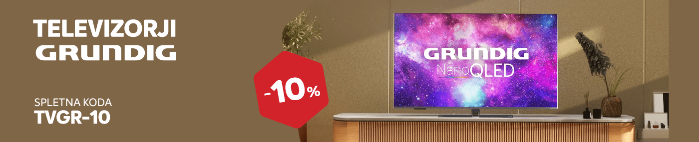 Spletna koda za 10 % popusta velja od 15. 4. do 21. 4. 2025 pri nakupu v Spletnemu centru Merkur na televizorje GRUNDIG. Ob plačilu v spletni košarici vnesite kodo TVGR-10. Koda za popust se ne sešteva z ostalimi kuponi in boni. Koda velja za nakupe po rednih cenah in ne velja na ostale akcije. Koda ne velja na izdelke z oznako SPLETNI HIT. Kako unovčiti kodo pri spletnem nakupu, si lahko preberete TUKAJ.