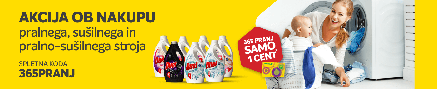 Akcija "Bonus pralni detergent za 365 pranj", ki traja od 6. do 18. 3. 2024, velja ob nakupu katerega koli pralnega, sušilnega ali pralno-sušilnega stroja. Za koriščenje akcije je potrebno v košarico dodati izbran aparat ter komplet pralnega detergenta Duel za 365 pranj. Kot pomoč, najdete pod sliko aparata že narejen komplet in z enim klikom dodate v košarico stroj + detergent. V košaridci nato obvezno vnesite spletno kodo 365PRANJ, ki vam bo znižala ceno praška na 1 cent.