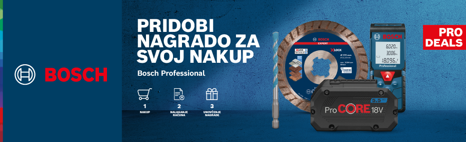 Kupite električna orodja Bosch Professional 18V, vrtna orodja, merilna orodja, baterije, polnilnike ali začetne komplete na spletu ali v trgovini in prejmite nagrado glede na skupni znesek nakupa (vrednost računa). Promocija traja od 1.05.2025 (0:00) do 31.08.2025 (24:00).