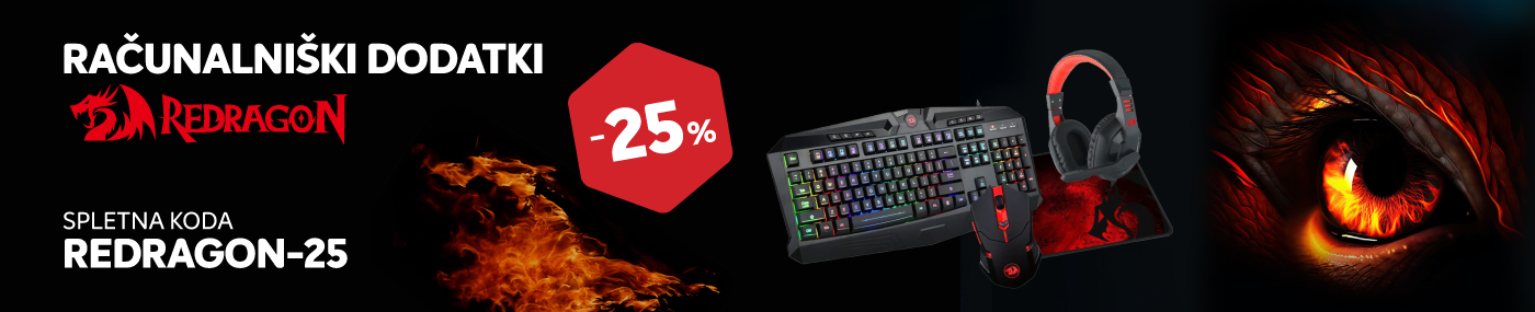 Spletna koda za 25 % popusta velja od 3. 11. do 19. 11. 2025 pri nakupu v Spletnemu centru Merkur na izdelke blagovne znamke REDRAGON. Ob plačilu v spletni košarici vnesite kodo REDRAGON-25. Koda za popust se ne sešteva z ostalimi kuponi in boni. Koda velja za nakupe po rednih cenah in ne velja na ostale akcije. Koda ne velja na izdelke označene z oznako SPLETNI HIT. Kako unovčiti kodo pri spletnem nakupu, si lahko preberete TUKAJ.