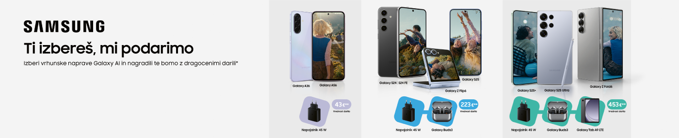 Pomladna promocija Samsung galaxy velja od 27. 3. do 4. 5. 2025, oziroma do prodaje zalog. Ob nakupu izbranih izdelkov Samsung galaxy lahko ridobite pravico do darila. Da bi kupec naprave pridobil pravico do darila, se mora registrirati preko Samsung Members aplikacije, ki je prednameščena na kupljeni napravi. Registracija preko aplikacije Samsung Members mora biti uspešno zaključena najpozneje do 5.6.2025. Darilo bo na uporabnikov naslov dostavljeno najpozneje do 30.9.2025. Za pridobitev pravice do darila, preberite pravila promocije, ki so na voljo: TUKAJ