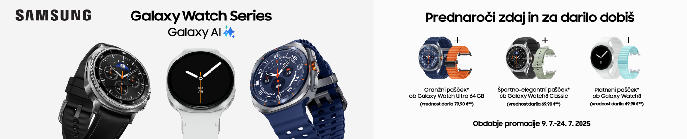 Promocija v času prednaročil za nove Samsung ure velja od 9. 7. do 24. 7. 2025. Točen seznam pametnih ur Galaxy, ki so vključene v promocijo in seznam daril je naveden v pravilih promocije. Kupci v času promocije prejemejo darilo pašček za uro. Darilo je odvisno od kupljene naprave. Za uveljavljanje pravice do darila je nujno potrebno prebrati pogoje za pridobitev darila, ki so navedni tukaj. Natančnejše informacije in pravila promocije so na voljo TUKAJ. Predmetna promocija se zaključi pred navedenim rokom v primeru izteka zalog naprav ali daril, predvidenih za to promocijo. Samsung bo brez odlašanja objavil obvestilo o morebitni predčasni prekinitvi promocije na enak način, kot je objavil ta pravila.