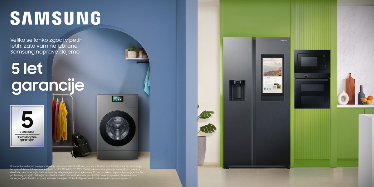 V obdobju od 13.01.2025 do 31.12.2025 lahko pridobite pravico do 5 letne garancije ob nakupu izbranih SAMSUNG aparatov.
