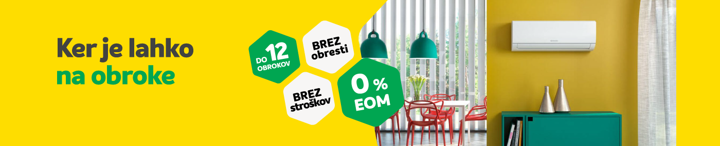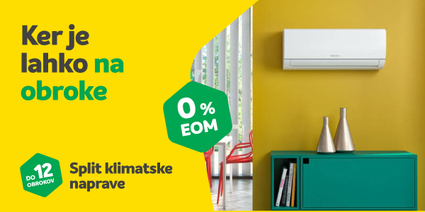 Promocija ob nakupu split klimatske napreve na 12 obrokov brez obresti, stroškov odobritve in zavarovanje, velja od 22. 5. 2024 do 19. 6. 2024. V primeru nakupa izbrane klimatske naparave je na voljo kredit Leanpay po "EOM 0%". Promocija velja samo za nakup na merkur.si in ne velja v Merkurejvih trgovskih centrih. Več informacij je na voljo TUKAJ