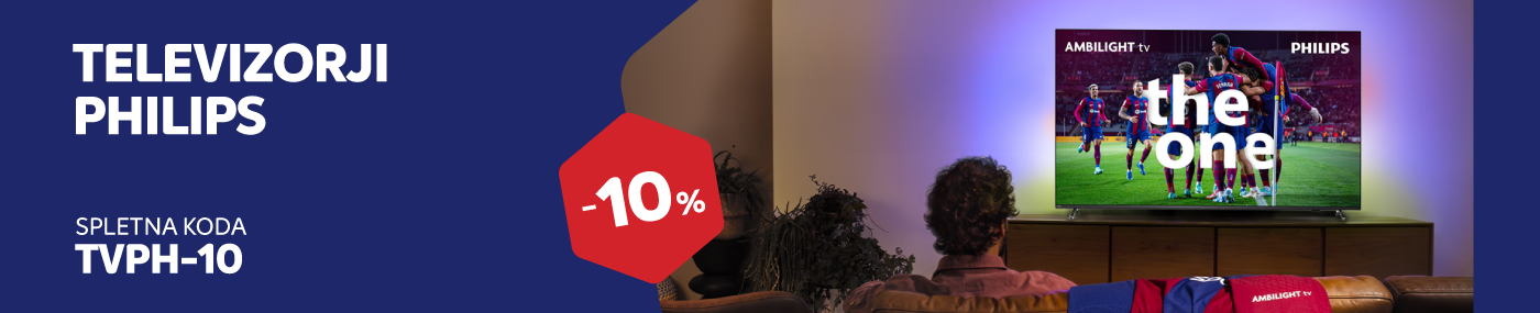 Spletna koda za 10 % popusta velja od 20. 10. do 26. 10. 2025 pri nakupu v Spletnemu centru Merkur na PHILIPS televizorje. Ob plačilu v spletni košarici vnesite kodo TVPH-10. Koda za popust se ne sešteva z ostalimi kuponi in boni. Koda velja za nakupe po rednih cenah in ne velja na ostale akcije in izdelke z oznako SPLETNI HIT. Kako unovčiti kodo pri spletnem nakupu, si lahko preberete TUKAJ.