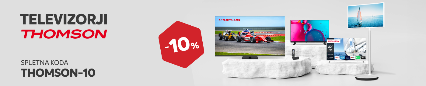 Spletna koda za 10 % popusta velja od 1. 8. do 31. 8. 2025 pri nakupu v Spletnemu centru Merkur na televizorje THOMSON. Ob plačilu v spletni košarici vnesite kodo THOMSON-10. Koda za popust se ne sešteva z ostalimi kuponi in boni. Koda velja za nakupe po rednih cenah in ne velja na ostale akcije in izdelke označene z oznako SPLETNI HIT . Kako unovčiti kodo pri spletnem nakupu, si lahko preberete TUKAJ.