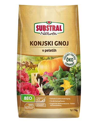 - Sestava: 100 % konjski gnoj 100 do 200 g/m² zadelamo v zemljo